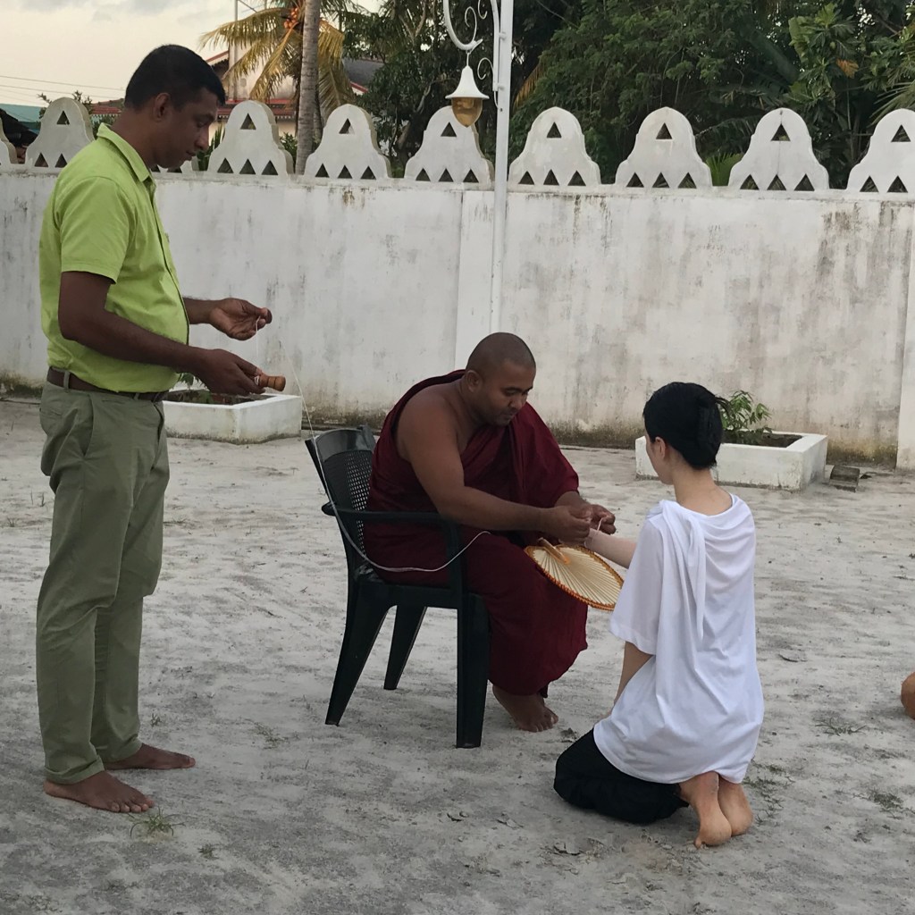 翌日はそのお坊さんがおられる近所のお寺にも連れて行って頂き、また白い糸のお守りを頂いたのでした。スリランカは人口の7割が仏教徒で、お寺に行く時は白い服で露出がないものを着るそうですよ〜。