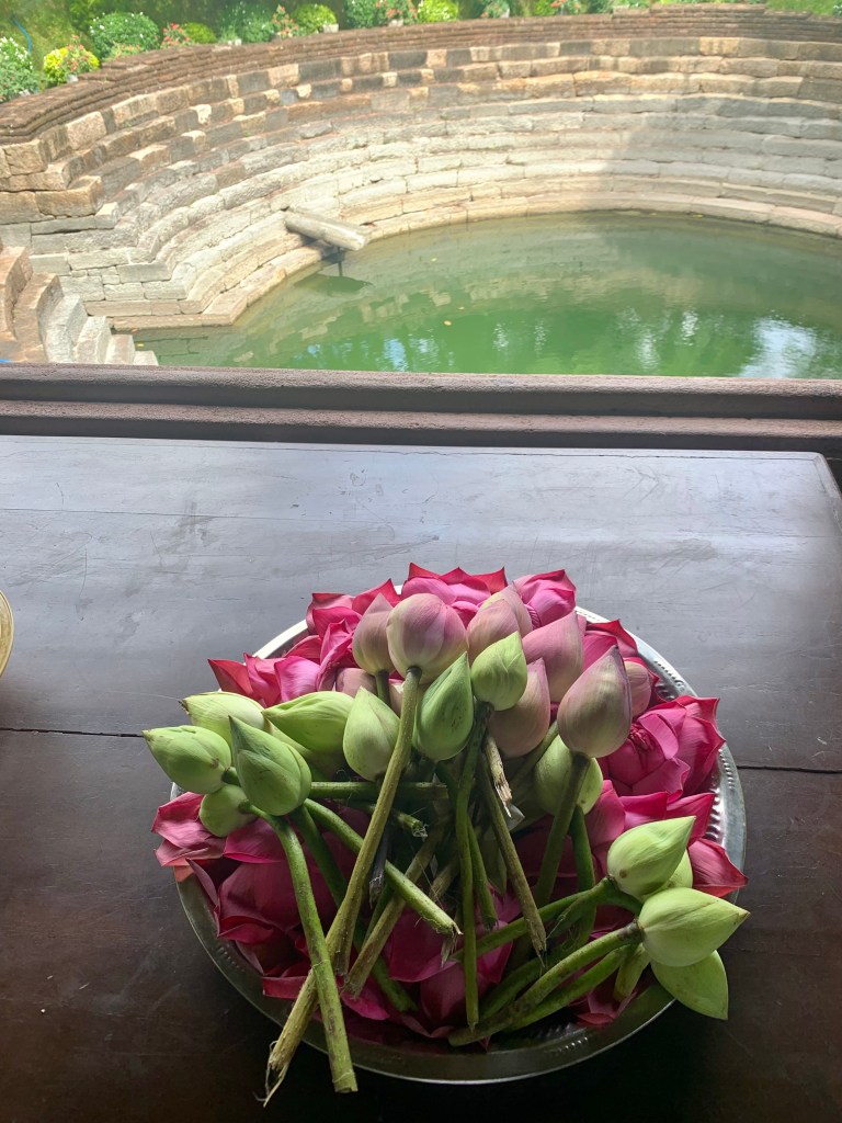 私たちも、ルワンウェリ サーヤ大塔が右手にくるように、蓮の花を合掌の手に挟み、祈りながら一周した後に、お花をお供えしてきました。
